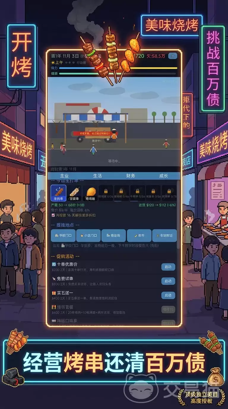 整个游戏的核心剧情线,可以清晰地划分为三个阶段:“债务清零→规模扩张→品牌连锁”。初期阶段,每一分钱都要掰成两半花,摊位租金、食材采购、设备维护……样样都是成本,精打细算是活下去的唯一法则。熬过初创期,进入中期,利润开始产生复利效应,偿还第一笔百万欠款的目标将变得触手可及。而游戏的终极魅力在于后期:你不再满足于一个摊位,可以将业务拓展至多个城市,研发独门秘制酱料,甚至打造属于自己的IP形象。最终的目标,是实现从街边小摊到全国性烧烤帝国的华丽跃迁。