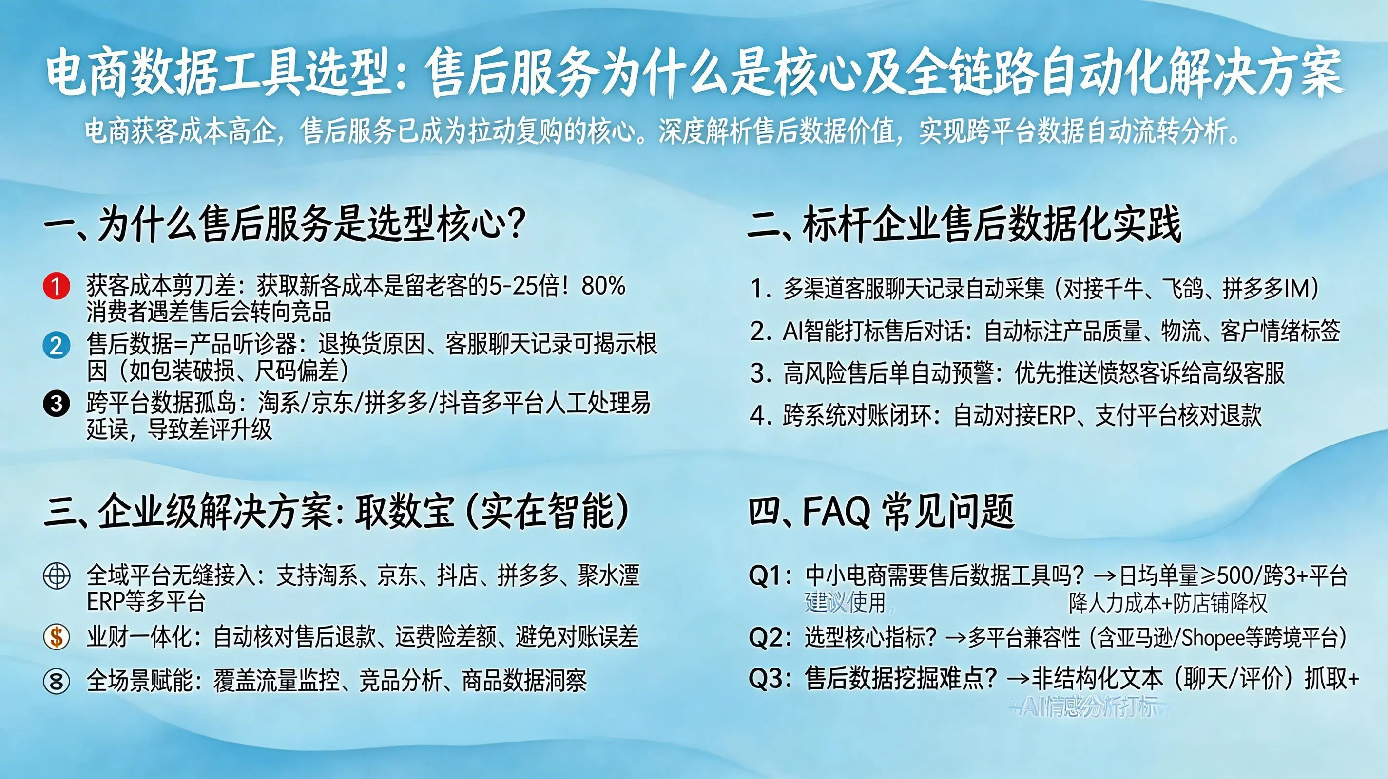 流量红利见顶,这已经是电商行业的共识。当绝大多数企业还在执着于优化前端的引流和转化时,一个决定利润深度的底层逻辑正在凸显:企业的持续增长,越来越依赖于对存量用户的精细化运营。这就引出了一个核心判断:在挑选电商数据工具时,能否高效处理和分析售后服务数据,应该成为最重要的决策维度。原因很简单,售后数据直接决定了复购率、品牌口碑和产品迭代的精准度。那些能打通并深挖这块数据资产的企业,才能真正构筑起自己的护城河。