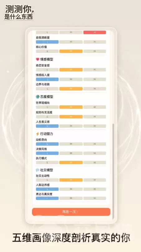 更值得一提的是,游戏支持无限次重测。每一次的作答结果都可以独立保存,并进行横向对比。这意味着,你可以通过多次测试的数据变化,直观地观察自身思维模式的动态演进,从而验证个人调整策略是否真正有效。这种“测评—反馈—再测评”的闭环设计,强化了工具属性,弱化了娱乐依赖,使得产品能够真正服务于人格发展与自我教育的长期目标。