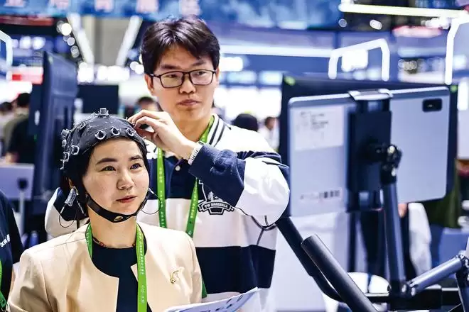在未来产业展区,上海脑虎科技有限公司的工作人员潘伊琪指着一款脑机接口设备介绍:“我们是带着能解决产业痛点的技术来找合作的。”这款能让瘫痪患者通过“意念”控制假肢的设备,参展不到半天,就收获了十多家企业和机构的合作意向。
