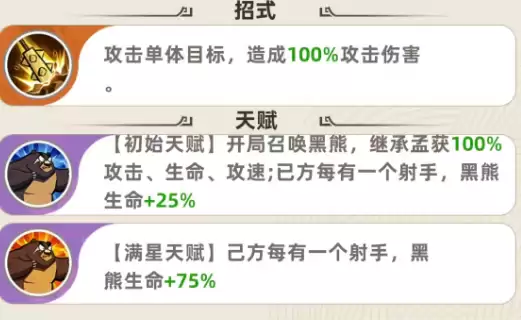 游戏中的孟获,在神话品质的射手圈里,知名度算是相当高的。身为射手,他的基础攻速表现不错,2.86秒的出手间隔,比起那些动辄超过3秒的角色,已经算是利落不少。他主打物理伤害,后期针对单体敌人时,输出效率很高,能造成百分百的攻击伤害。更关键的是他的天赋机制:开局就能召唤一头黑熊助战。