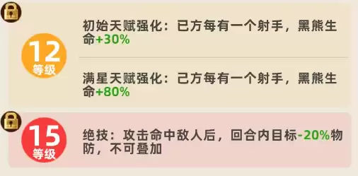 而升到12级,则是他天赋体系的又一次飞跃。此时,基础天赋得到强化:每有一名射手队友,黑熊的生命加成提升至30%。如果此时天赋已达满星,这个加成会进一步飙升至80%每名射手。换句话说,在12级满星的理想状态下,黑熊能获得的生命加成是极其恐怖的。
