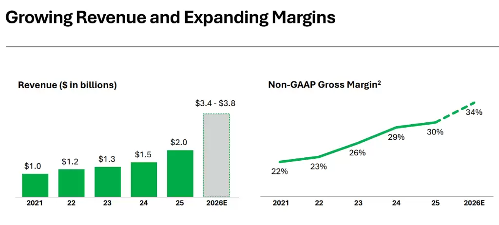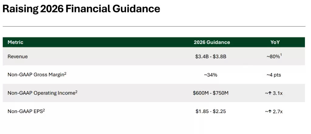 对比一下华尔街的预期,这份指引的“激进”程度更为明显。据《华尔街日报》报道,分析师此前普遍预期公司全年调整后EPS为1.42美元、营收为32.4亿美元。显然,公司的新指引在两项核心指标上均大幅超出了市场预期。