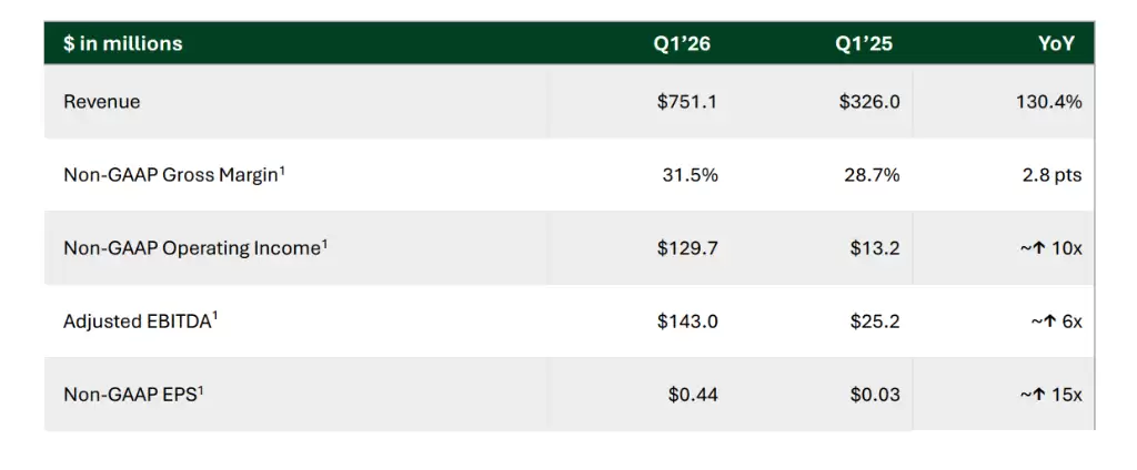 先看具体数据。一季度,Bloom Energy实现营收7.511亿美元,同比飙升130%,远超市场预期的5.4亿美元。