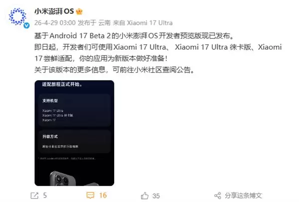 小米澎湃OS迎来Android 17 Beta 2开发者预览版 4月29日,小米澎湃OS官方发布消息,基于Android 17 Beta 2的开发者预览版现已正式推出。对于热衷于前沿技术的开发者而言,这无疑是一个重要的尝鲜机会。 目前,该预览版支持小米17 Ultra、小米17 Ultra徕卡版以及