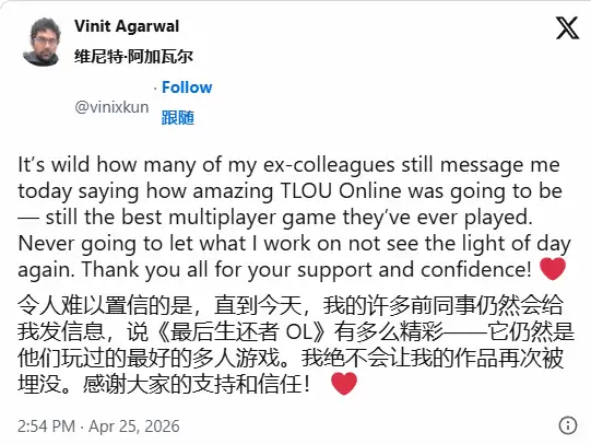 这份内部的惋惜之情并未随时间消散。项目前负责人Vinit Agarwal近期在X平台分享的动态,就像一枚投入平静湖面的石子。他提到,至今仍有前同事私下与他交流,而大家的共识依然明确——都认可《最后生还者Online》原本具备的出色品质。对于一位主创而言,这种来自并肩作战过的伙伴的肯定,或许是最好的慰藉,也是最深的遗憾。Agarwal也明确表态,他会将此次经历化为宝贵的教训,确保自己未来负责的项目不再重蹈覆辙,避免再度遭遇中途夭折的命运。