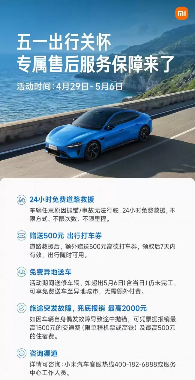 小米汽车2026年五一假期出行关怀服务细则发布 假期出行,最怕车辆“掉链子”。为此,小米汽车已正式启动2026年五一假期的出行关怀售后服务保障。活动覆盖整个出行高峰时段,从4月29日持续至5月6日。具体有哪些贴心保障?我们一起来看。 24小时免费道路救援 万一车辆在路上因任意原因抛锚或发生事故无法行
