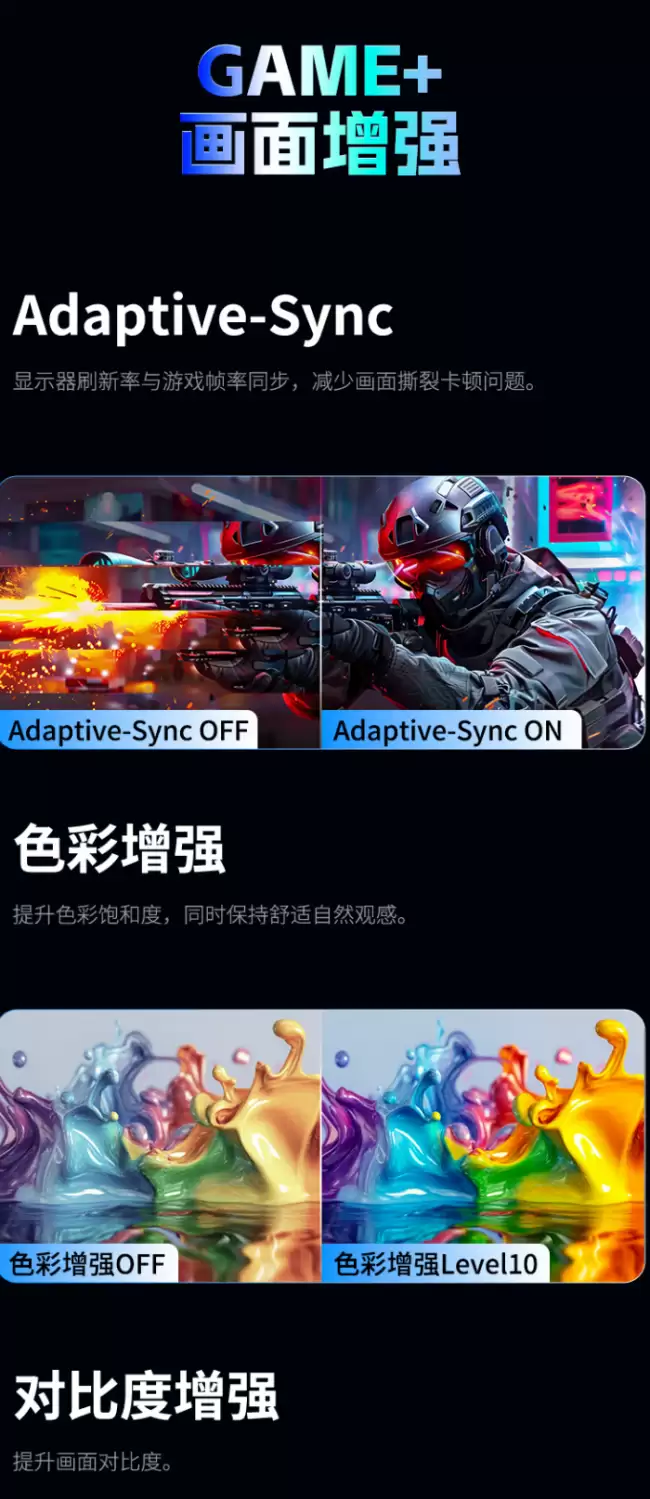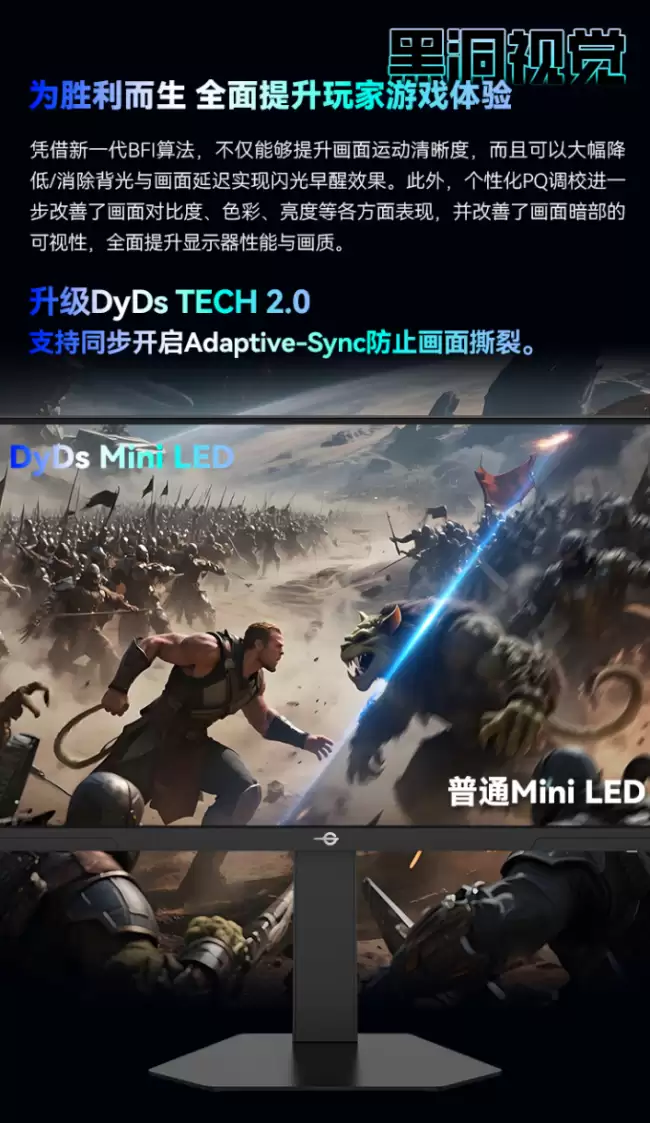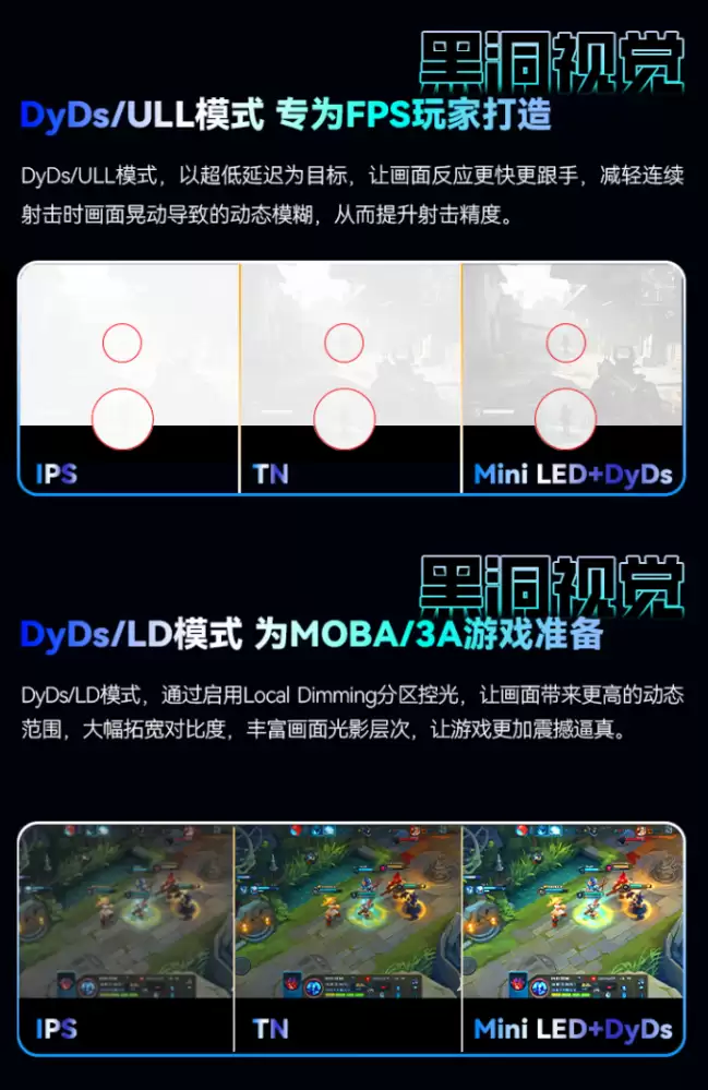 说到核心体验,就不得不提其搭载的DyDs TECH黑洞视觉独家技术。这项技术旨在解决高速运动场景下的画面拖影难题,能让疾速移动的游戏画面保持清晰、稳定不模糊。更关键的是,它能大幅降低甚至消除背光与画面之间的延迟,实现所谓的“闪光早醒”效果,这对于分秒必争的竞技游戏而言,意味着更跟手的视觉反馈。