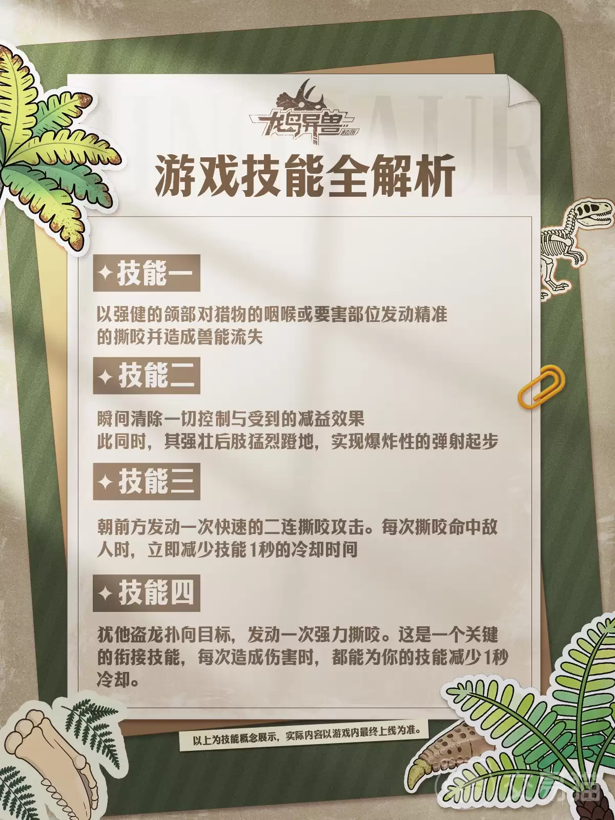 先看基础设定:犹他盗龙的体长稳定在5到7米之间,这在整个驰龙家族里都算得上是“重量级选手”。支撑其霸主地位的,是那对演化到极致的、长达22厘米的巨型镰状趾爪,再配合强健的后肢与灵活的脊柱,让它一旦近身,便如同一位兼具爆发力、精准度与持续压制能力的格斗大师。游戏将其定位为高机动型近战输出核心,而它的技能体系,则围绕“控制、净化、续航、重置”四大逻辑,环环相扣,形成了一个近乎完美的战斗闭环。