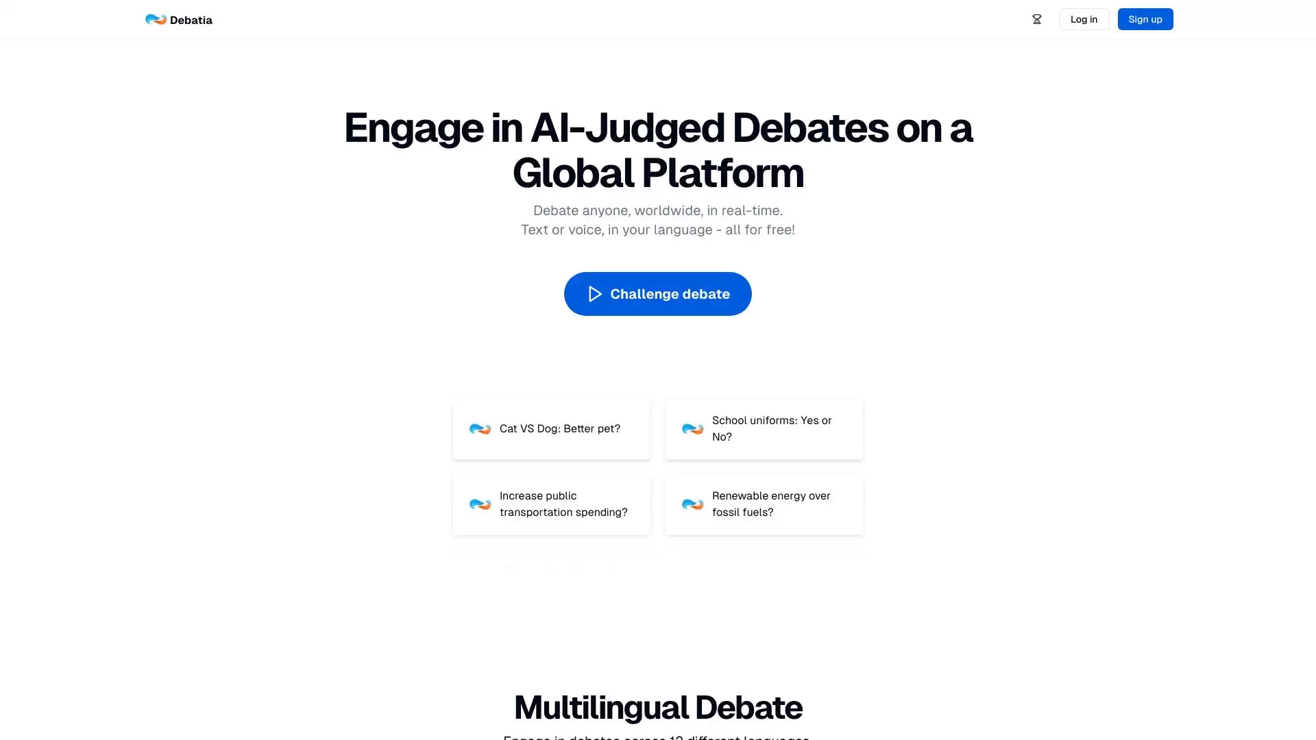 先说说这个平台的核心定位:Debatia是一个由AI充当裁判的在线辩论平台,主打实时互动和多语言支持。