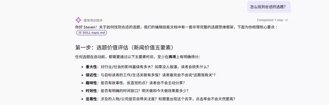 当询问它“如何寻找选题”时,它返回的是从技能库中抽取的“Know-How”——每一条都挂着团队内部写过的判断标准。这套答案是我们自己的语言、自己的标准、自己的方法论,而不是ChatGPT或Claude的通用回答。