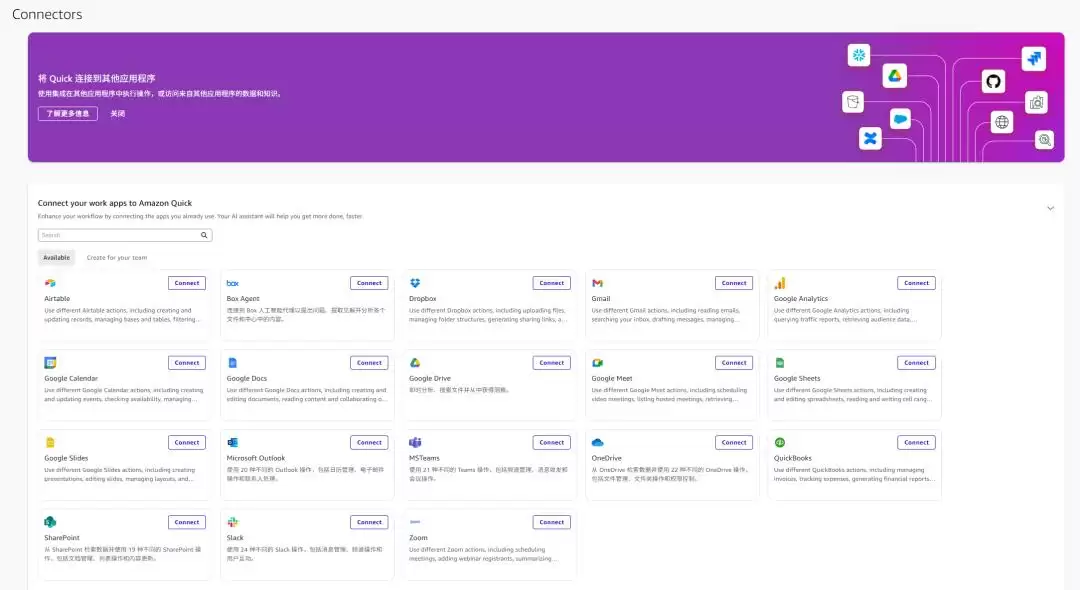 Amazon Quick是少数能将“常驻桌面 + 企业级合规 + 跨厂商SaaS集成”这三件事同时做好的产品。其底层依赖于亚马逊云科技二十年积累的两大基石:安全合规底座和全连接器货架。前者意味着Quick默认遵循亚马逊云科技的企业安全合规路径,企业数据不会用于训练;后者意味着Amazon Quick一上线就接入了Slack、Google Workspace、Zoom等几十个原生连接器。
