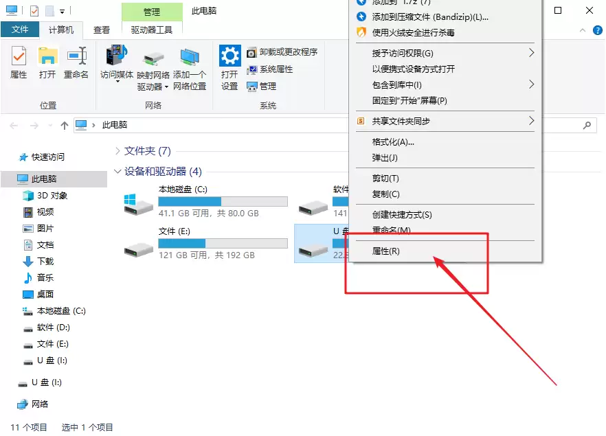 1. 在“此电脑”中,找到并右键点击出问题的移动硬盘,从菜单中选择“属性”。