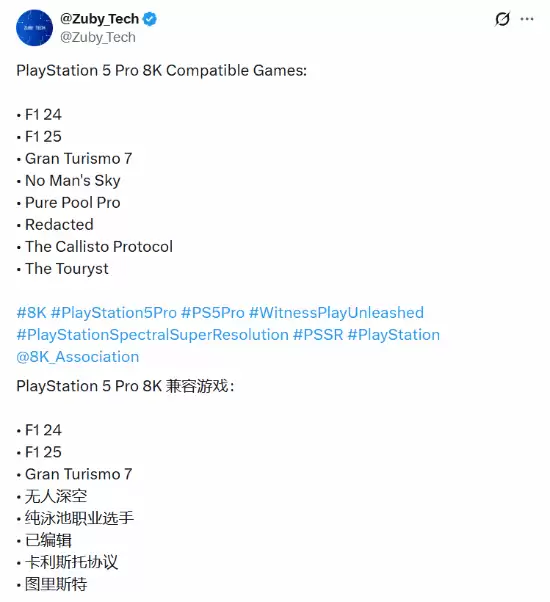 索尼PS5 Pro的8K承诺:这次真的来了吗? 关于索尼PS5系列主机的8K画质宣传,玩家圈里的讨论和质疑声一直没停过。毕竟,口号喊了这么久,真正能兑现的体验却寥寥无几。不过,最近这事儿似乎有了转机。知名爆料博主Zuby_Tech直接甩出了一份PlayStation 5 Pro的8K兼容游戏名单,算