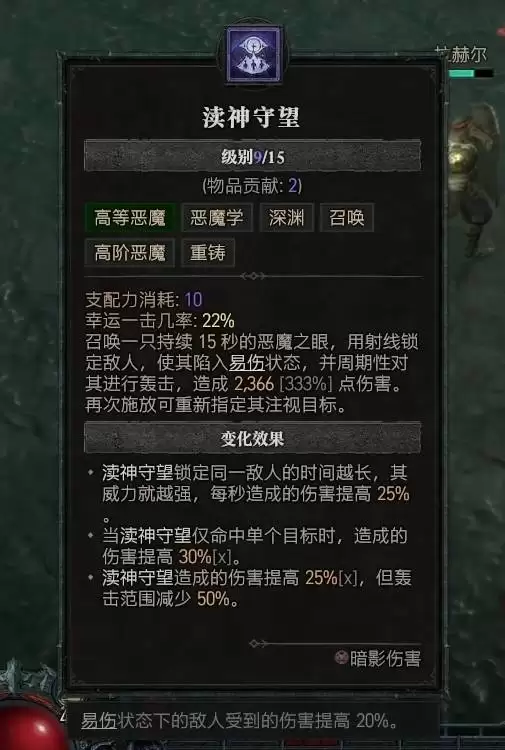 面对血厚防高的单体首领时,群体攻击难免有些力不从心。“渎神守望”正是为此准备的杀手锏。召唤出的恶魔之眼会发射射线锁定一个目标,不仅使其陷入易伤状态,还能持续造成巨额伤害,是处理BOSS战的利器。