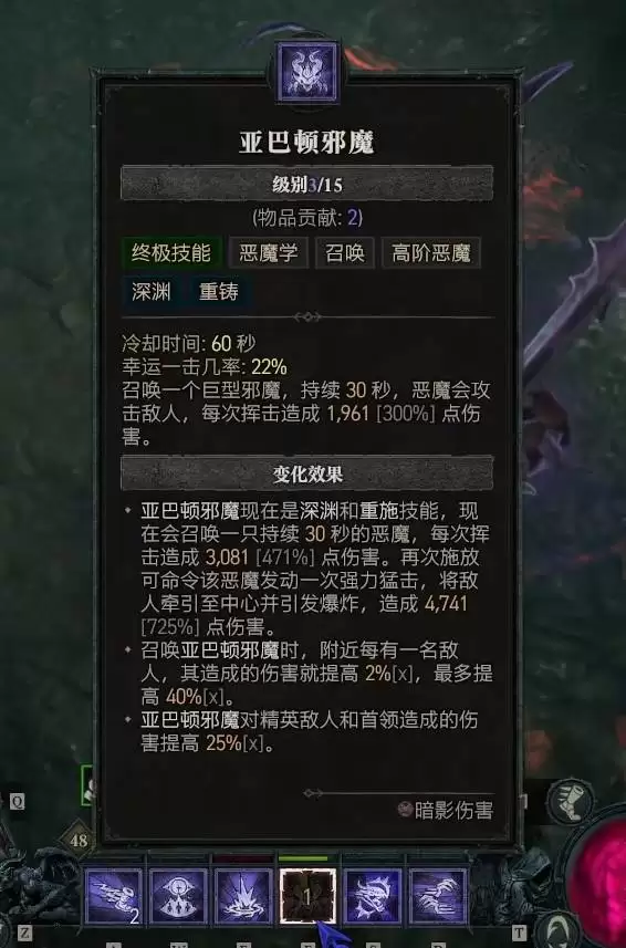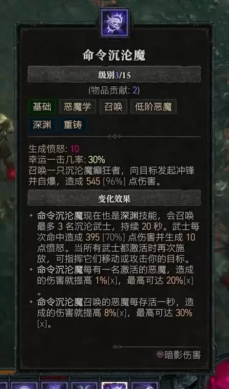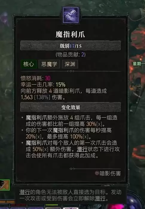 这套构筑的核心思路,在于巧妙融合暗影之力与恶魔仆从。当角色等级达到40级、解锁终极技能后,有一个关键转变:建议将终极技能更换为“变形”。变身后的暗影形态,不仅能提供强大的生存能力,更能为核心输出技能“魔指利爪”带来可观的伤害加成。围绕这一核心,技能加点的顺序可以遵循:变形→伤害成长→支配力→恐惧恶魔。