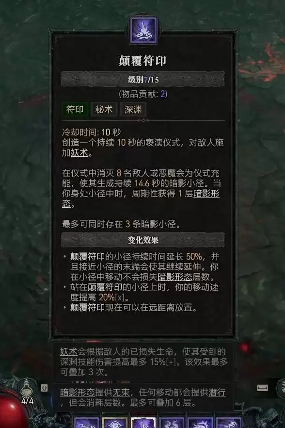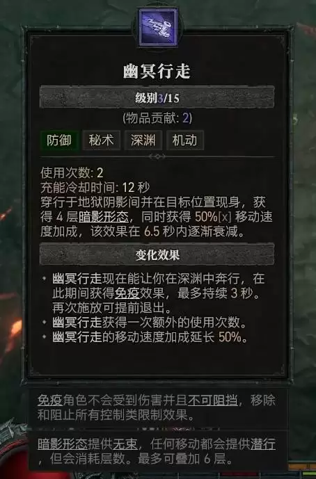 一个优秀的术士必须懂得进退之道。“幽冥行走”便是你的关键位移技能。它的妙用不止于闪转腾挪,更在于可以通过施放它来主动进入暗影形态,在需要时提供额外的生存窗口或触发相关增益。