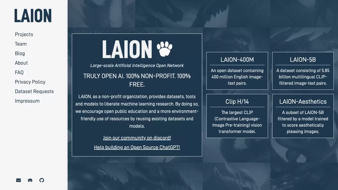 LAION,即大规模人工智能开放网络,是一个非营利组织,致力于使机器学习资源向公众开放。他们提供数据集、工具和模型,以促进开放的研究、教育和环保实践,鼓励重新利用现有资源。