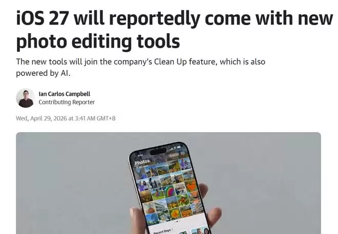 苹果AI影像战略再落子:iOS 27相册将迎三大专业级AI编辑工具 来源:环球网 【环球网科技综合报道】苹果的AI战略布局,正一步步将蓝图变为现实。最新消息显示,即将在今年亮相的新一代移动端操作系统iOS 27,将成为其智能能力集中进化的关键载体。根据瘾科技4月29日的报道,苹果计划在iOS 27、