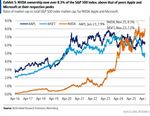 首先是体量问题。英伟达目前在标普500指数中的权重已占到约8.3%,这个比例甚至超过了苹果和微软各自的历史峰值。当整个半导体板块在指数中的比重也攀升到17%左右,许多“紧贴基准”配置的资金,客观上已经很难继续大幅加仓。除非未来有更多大型私有AI公司上市,带动指数结构出现“再平衡”,这种约束才可能缓解。