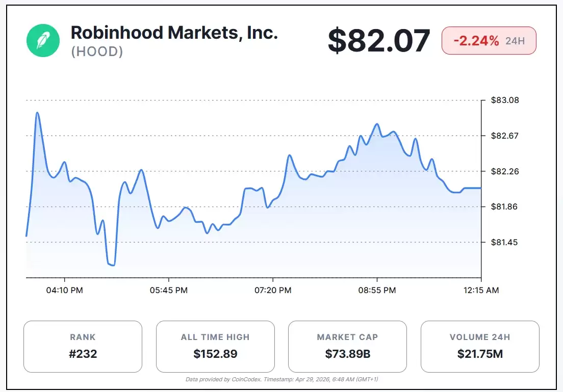 Robinhood Markets Inc.(纳斯达克股票代码:HOOD)最新发布的第一季度财报,未能满足华尔街的期待。这份成绩单一出,市场立刻给出了反应,公司股价在盘后交易中承受了不小的压力。回顾过去24小时,HOOD股价下跌了2.24%,最终收报82.07美元,盘中则在81.45美元至83.08美元之间波动。
