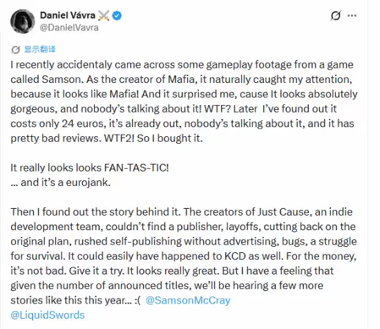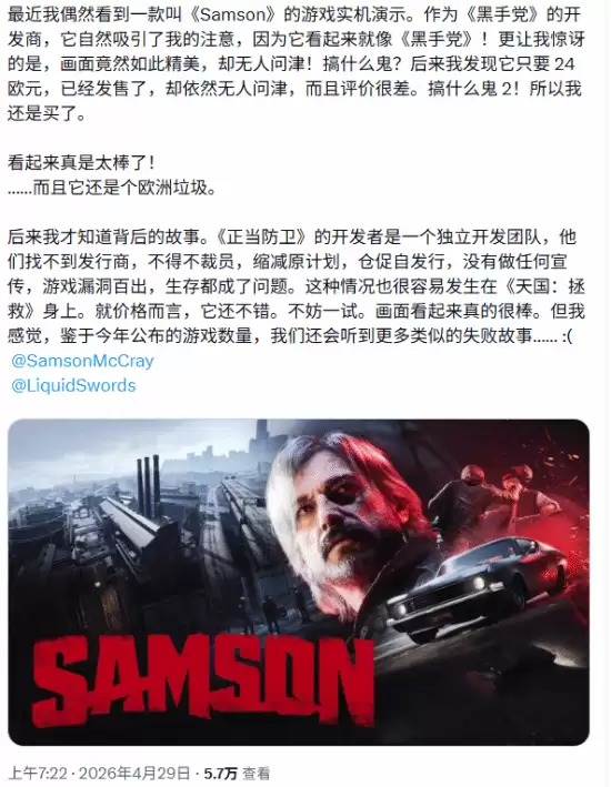 当《天国:拯救》与《四海兄弟》的缔造者都愿为其站台 能让丹尼尔·瓦夫拉这样的人物公开称赞,一款游戏多少有点不凡之处。今天,这位《四海兄弟》与《天国:拯救》的知名制作人,在社交媒体上为犯罪动作游戏《Samson》发了声。他直言游戏“看起来真太棒了”,同时也对其市场遇冷的遭遇感到惋惜——这里得插一句,“
