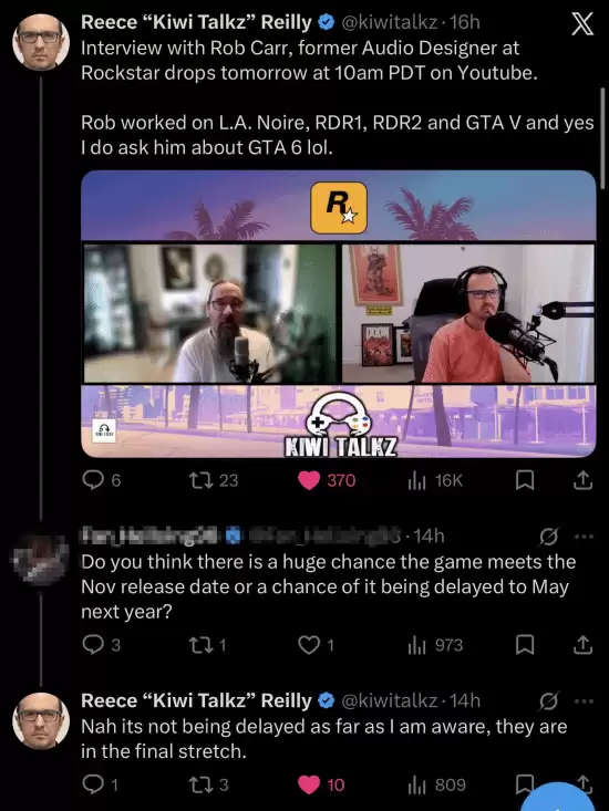 与此同时,另一则相关动态也为这波期待热潮增添了新的看点。曾任职于Rockstar的音频设计师Rob Carr将于明日接受深度访谈,据悉内容将涉及《GTA6》的幕后信息。这场访谈预计将进一步激发全球玩家群体的热烈讨论与猜测。