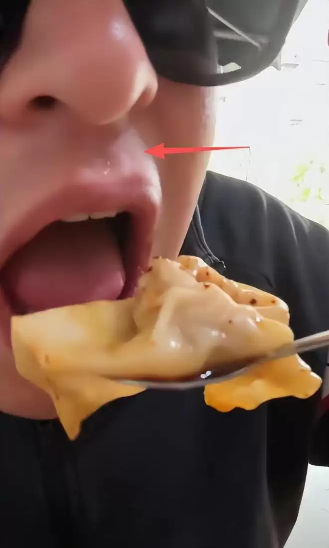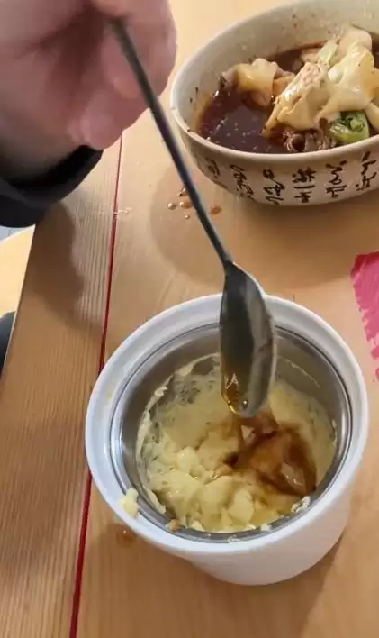 蒸蛋口感细腻滑嫩,肉末炖得酥软入味,鲜香汤汁完全渗透其中。他一边品尝一边点头,即便腮帮鼓起仍不忘加两勺红油提味。抄手皮薄馅大,裹满红油汤汁,与蒸蛋搭配食用,香辣过瘾,风味十足。