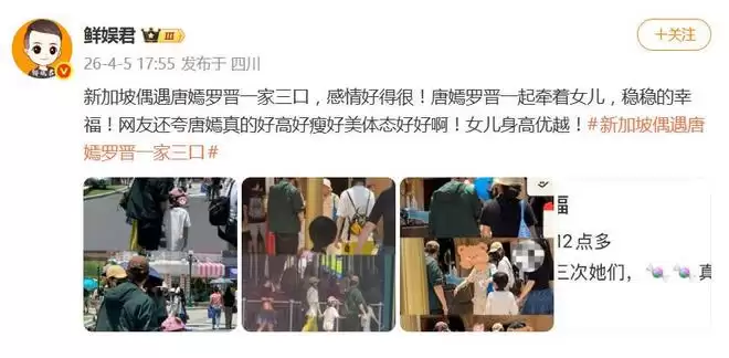 新加坡环球影城的一波偶遇照,直接把唐嫣和罗晋送上了热搜。本来大家还在猜这两口子是不是“貌合神离”,结果人家直接带着6岁的女儿小小糖在国外逍遥快活呢。这一家三口的同框画面,不仅甜度超标,更是把那些唱衰
