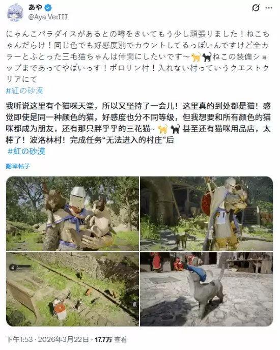 一位玩家深情地留言:“几年前,我现实中所养的三花猫离开了。如今在《红色沙漠》里,我想我知道该找谁陪伴我了。”另一位玩家则用游戏内一只黑白花色的奶牛猫,来纪念自己现实中的爱猫“Kitty先生”,以此完成了一次跨越虚拟与现实的情感联结。
