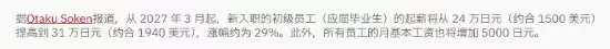 具体来看,从2027年3月开始,刚从校门踏入科乐美的毕业生,起薪会从现在的24万日元(约合软妹币10378元)跃升至31万日元(约13405元),涨幅接近三成。与此同时,公司所有在岗员工的月基本工资,也都会统一增加5000日元。