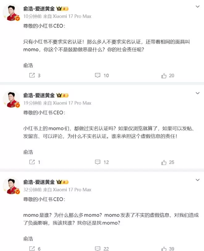 俞浩连发三条微博实名喊话小红书CEO:公开质疑平台实名机制