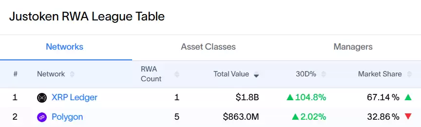 市场份额的此消彼长非常明显。最初,Polygon托管了Justoken已部署RWA总价值的约49%,对应资产价值86.3亿美元,而XRP Ledger当时以51%的份额略占上风。然而,在JMWH价值飙升之后,格局彻底改变。XRP Ledger的份额大幅扩张了33%,达到了目前的67%;反观Polygon,其份额则收索了33.6%,降至32.86%。这一增一减,足见单一核心资产的威力。