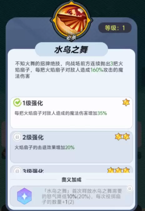 不知火舞在游戏中的起点可不低,初始等级便是SR。作为一名式神,她以高攻击力和迅捷的攻击速度著称。来看看她的成长路径:完成1级强化后,她对敌人的魔法伤害直接提升35%;2级强化则增强了火焰扇子的击退效果;而到了3级强化,每次扇子攻击带来的魔法伤害增幅高达55%。她的爆发技能“水鸟之舞”堪称绝技,能向场内连续抛出三把火焰扇子,每一把都蕴含着160%攻击力的惊人伤害。