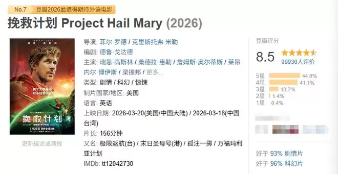 票房一路飘红的同时,影片口碑也全线坚挺。烂番茄新鲜度稳定在95%的高位,CinemaScore观众评分获A级评价,国内豆瓣平台也开出了8.5的出色开局分数。众多影迷与影评人已将其誉为近年来最卓越的科幻电影之一。