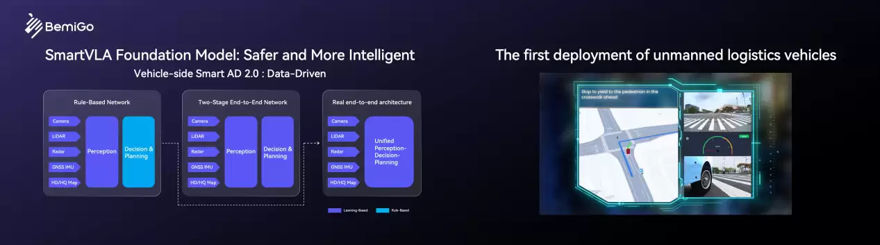 参数亮眼的背后,是更为扎实的技术底座。斑陌易行自研的Smartware2.0中间件,构建了一套乐高式的模块化软硬件架构。统一接口、预埋硬件、按需组合——这种设计思路直接带来了开箱即用、快速部署、易于扩展和维护的显著优势,让“即刻落地”不再是口号。而在算法层面,基于NVIDIA Alpamayo 1.5开源基座构建的SmartVLA大模型,首次在Jetson Thor平台上完成了无人物流车的部署。这赋予了车辆真正的场景理解与自主决策能力,让自动驾驶变得更安全、更智能。