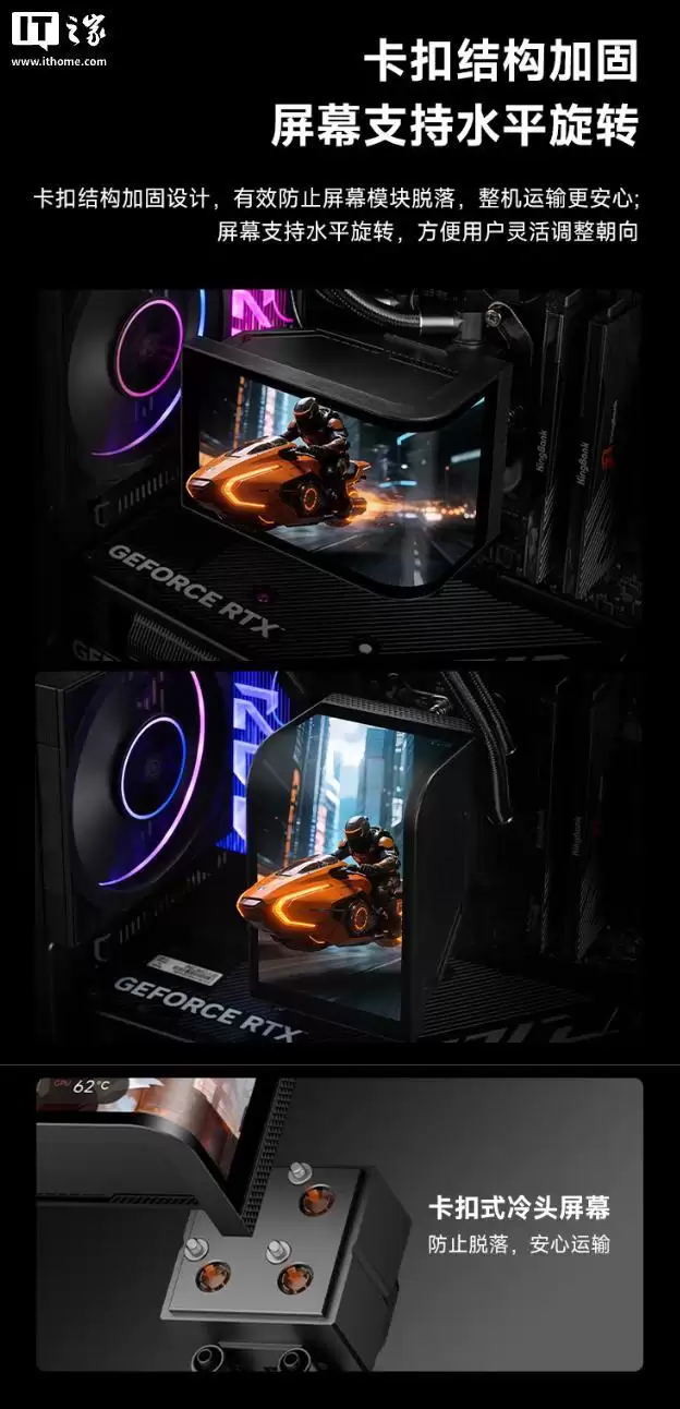 这款散热器的核心亮点,无疑是那颗设计独特的冷头。其尺寸为121毫米(长)x 89.5毫米(宽)x 112毫米(高),内部嵌入了一块6.67英寸的AMOLED曲面屏幕。分辨率达到了2400 x 1080,并且采用了AG防反光全贴合工艺。这意味着什么呢?简单来说,就是显示效果会更通透、更清晰,即使在光线复杂的机箱环境里,也能避免恼人的反光干扰。更巧妙的是,整个屏幕模块是通过卡扣方式固定在冷头上的,用户可以根据机箱布局和个人喜好,灵活地旋转调节屏幕角度,这无疑大大增加了安装和观赏的自由度。