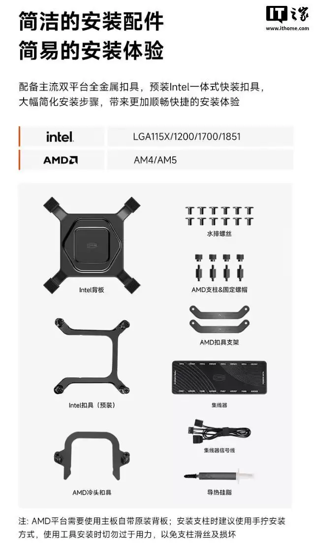 在兼容性上,DV360幻翼附送了全金属材质的简易安装扣具,广泛支持英特尔LGA 1851、1700、1200、115X以及AMD的AM4和AM5平台,覆盖了当前及未来一段时间的主流消费级平台。