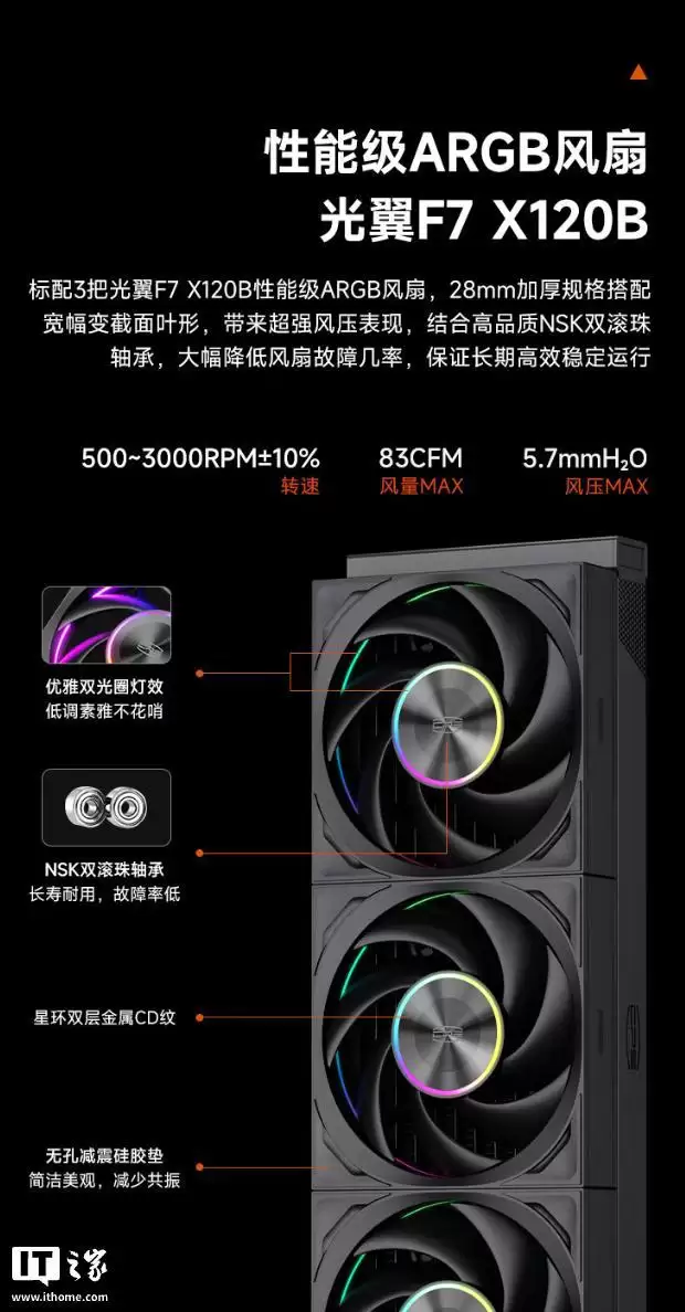 风扇方面,它配备的是超频三自家的光翼F7 X120B风扇,采用双滚珠轴承,耐用性更有保障。其转速范围在500至3000 RPM±10%之间,最大风量可达83 CFM,静压则能达到5.7 mmH2O。这样的风扇组合,足以确保冷排在高效排热的同时,维持相对安静的工作状态。