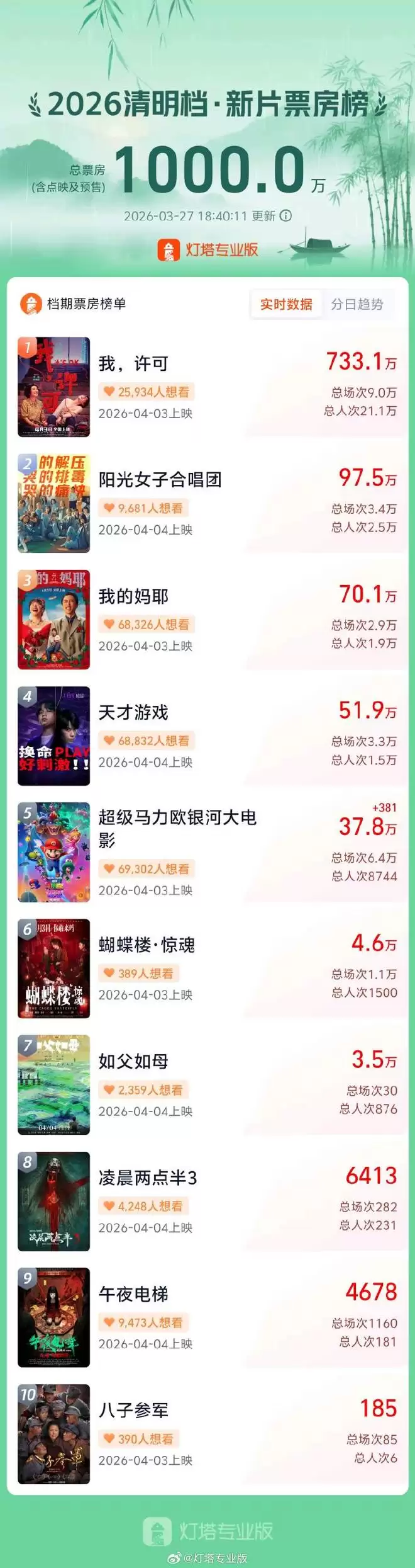 清明档新片预售破千万,市场热度提前引爆 今年清明档的票房热度,启动得比往年更为迅速。根据猫眼专业版实时数据,截至3月27日,档期内新上映影片的预售总票房已强势突破1000万元。这一亮眼成绩,为当前相对平淡的三月电影市场提前带来了显著的暖意与信心。 观察当前的预售榜单,格局已初步显现。影片《我,许可》