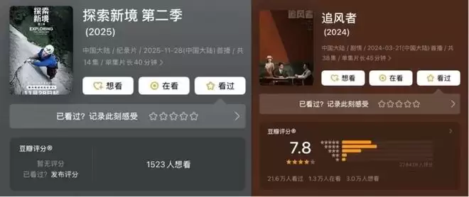 尽管身边不少爱好攀岩的朋友(并非王一博粉丝)都对这档纪录片赞不绝口,但从豆瓣数据看,关心这类小众运动的路人确实不多——第二季迄今只有1500多人标记了想看。作为对比,由王一博主演的《追风者》有超过20万人标记了看过或想看。