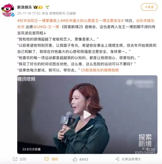 至于乐华,纵使在粉丝眼里有千般不好,但至少在王一博想要“做自己”这件事上,还是给了他足够多自由的——或者说,不得不给他自由。两年间,他几乎没有接影视项目,把大量时间投入到一档小众纪录片和高风险户外运动上,这些选择在商业逻辑上都不是最优解,但乐华没有阻拦——这本身就是“给自由”最直接的证据。在《探索新境2》发布会上,杜华曾这么评价王一博:“以前特别希望他特别厉害,让我有面子有光,希望他在事业上熠熠生辉。但从去年开始,我跟自己和解了,现在对他最大的期愿是注意安全、身体第一,不要太去冒险了。”