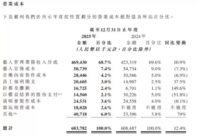 事实上,即便王一博不是乐华股东,他依然能从乐华拿走大量“分成”。乐华财报显示,公司最大的成本开支是艺人分成,占总成本的七成。2025年,这项成本接近4.7亿元,是2019年(2.4亿元)的近两倍。而这一年公司的总营收是9亿,净利润仅仅只有8000万,不到10%。