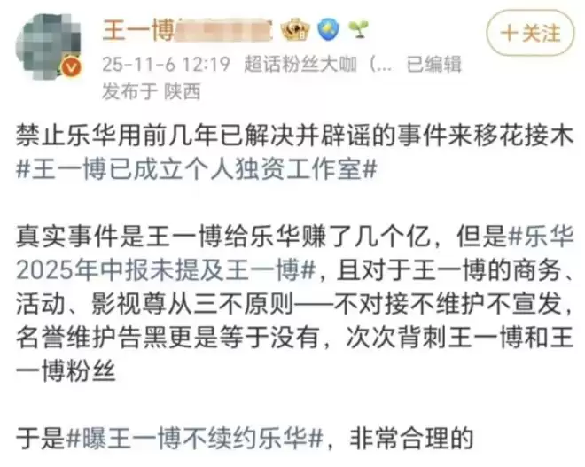 但如此一来,也暴露出了乐华过去一年多“去王一博化”的失败——从官微减少提及,到财报中有意淡化他的贡献,乐华试图向市场证明公司不只依赖一个人,结果却是不得不回到原点,用股份把王一博重新锁定在公司的叙事里。
