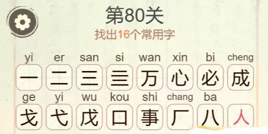 在《聪明开局吧》的第80关“万事必成”中,玩家需要从题目中找出16个常用汉字。最终的正确答案是:一、二、三、亖、万、心、必、成、戈、弋、戊、口、事、厂、八、人。