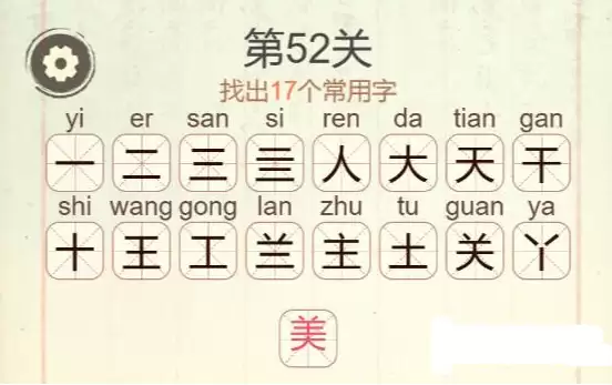 先来看看第52关的界面,核心就是屏幕中央的这个“美”字。我们的任务,就是把它“大卸八块”,找出所有隐藏的汉字。