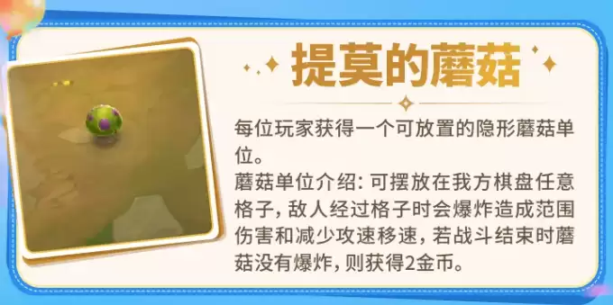提莫的蘑菇则给每个人提供了一个可以自由放置的隐形单位。把蘑菇放在己方棋盘上,敌人经过时会触发爆炸,造成范围伤害的同时,还能削减他们的攻速和移速。更有意思的是,如果一整场战斗下来蘑菇都没被踩爆,战后还能回收2金币。这个效果的即时战斗力不算顶尖,但2金币的“保底”收益也不差,相当于对面不踩就白赚。所以,摆放位置很讲究,得预判对手可能的站位走向,胡乱放的话很可能就浪费了。