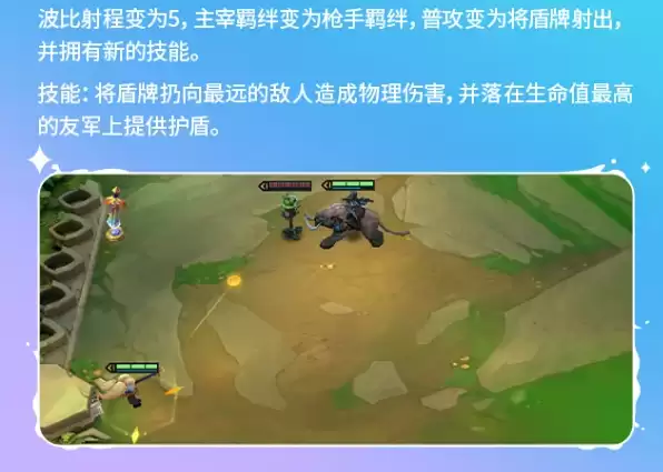 “炮形态波比”彻底改变了这位约德尔英雄的定位:射程提升至5格,羁绊从“主宰”变为“枪手”,普通攻击会将自己的盾牌丢出去,而技能则是向最远的敌人投掷盾牌造成物理伤害,随后盾牌会飞回生命值最高的友军身上,为其提供一个护盾。波比从一个近战坦克变身远程枪手,这个反差感十足。其技能兼具远程消耗和团队保护,如果能搭配一个足够结实的前排,护盾的收益会非常可观。