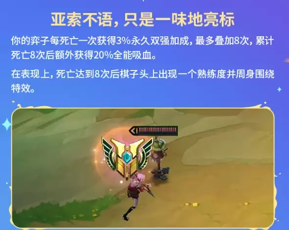 “托儿索”是一个典型的死亡叠加型符文。携带该符文的棋子每次阵亡,都会获得3%的永久双抗加成,最多可叠加8层。叠满后,额外获得20%的全能吸血,并且棋子头上会出现专属特效。这摆明了一条“越挫越勇”的路线,前期甚至可以有意让该棋子多参与战斗、多“牺牲”几次,争取在游戏中期将层数叠满,那么到了后期,它将成为一个又肉又能打的恐怖存在。