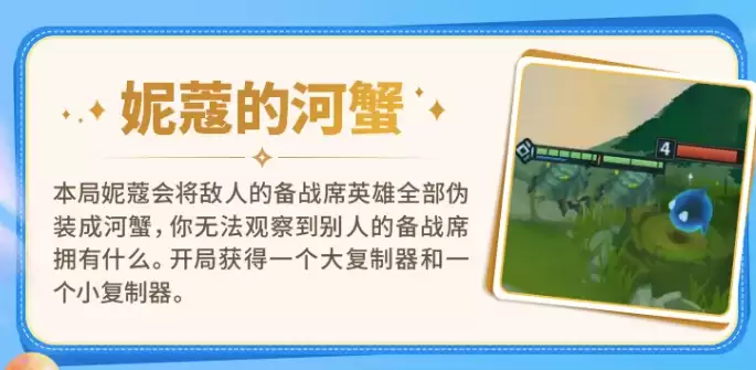 接下来是妮寇的河蟹,这个效果有点“搞心态”。它会把所有对手备战席上的英雄统统变成河蟹外观,让你完全看不出别人在偷偷摸摸攒什么阵容。作为补偿,开局会赠送一个大复制器和一个小复制器,资源上算是挺大方了。但这样一来,这局游戏基本就别想靠观察对手的备战席来调整自己的运营节奏了,一切只能靠自己规划。复制器的价值不言而喻,拿到手之后,最好先想清楚要复制哪个关键棋子,可别随随便便就用掉了。
